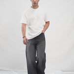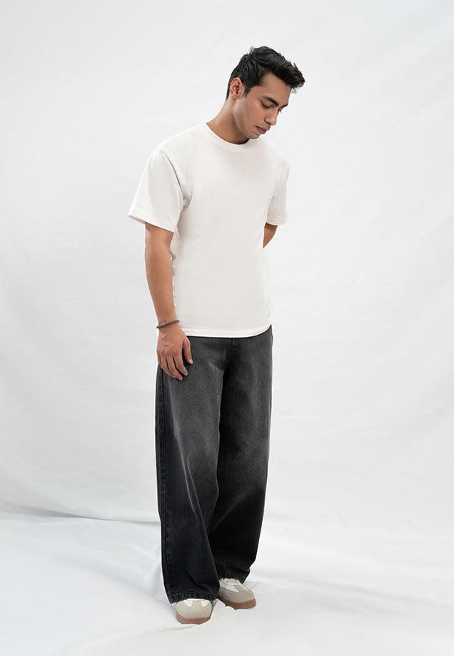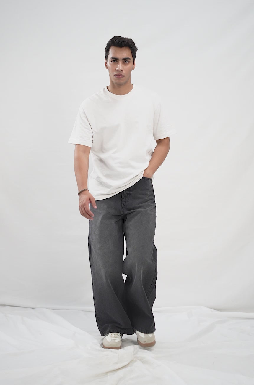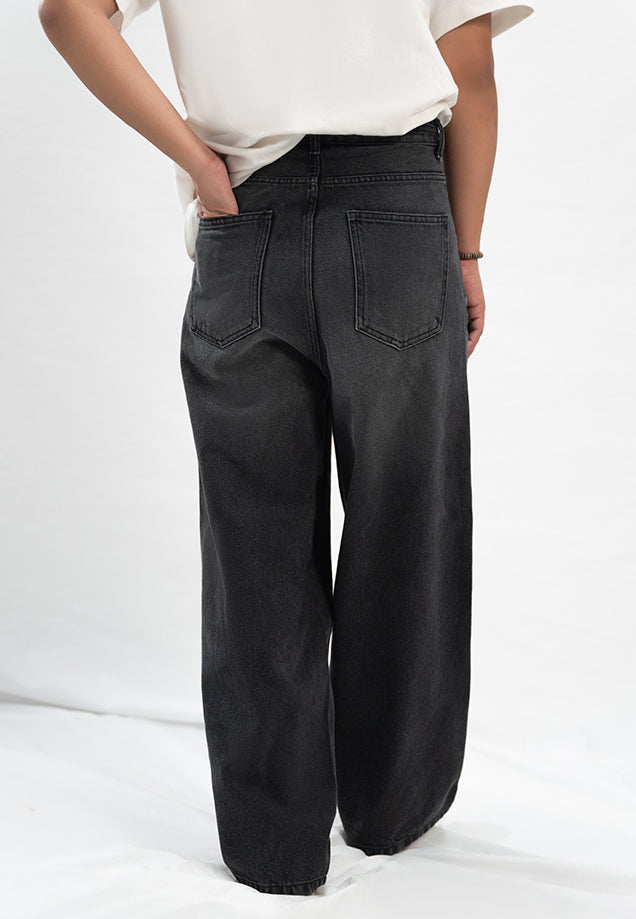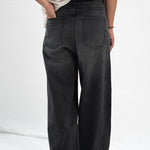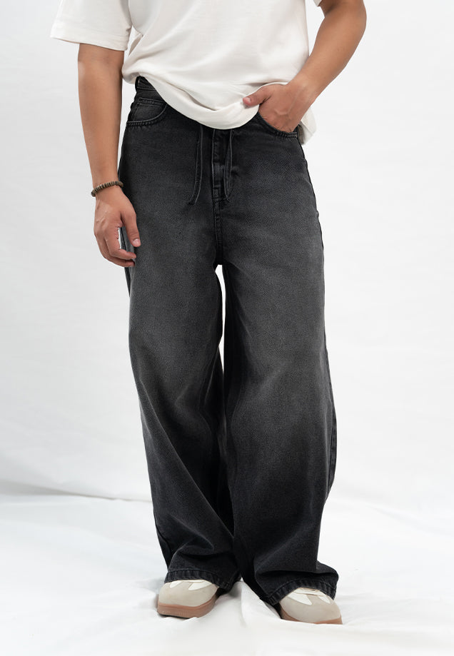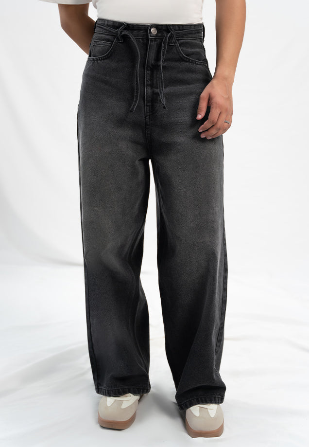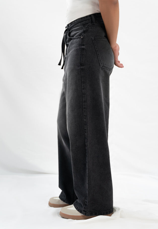 Super Wide Leg Jeans With Cord - Black Stone Wash
